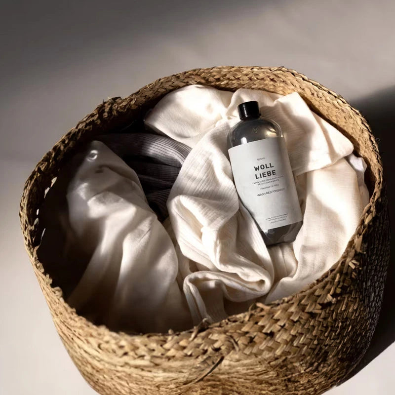 Herkömmliche Waschmittel enthalten oft Enzyme, die die empfindlichen Wollfasern angreifen und beschädigen können. Ein gutes Wollwaschmittel schützt die Fasern und sorgt dafür, dass deine Stücke länger halten. Am besten entscheidest du dich für ein parfümfreies Produkt, das sowohl für die Hand- als auch Maschinenwäsche geeignet ist. Es schont die Wolle, hilft dabei, Form und Farbe zu bewahren und verlängert so die Lebensdauer deiner DJIAN-Wollschals.